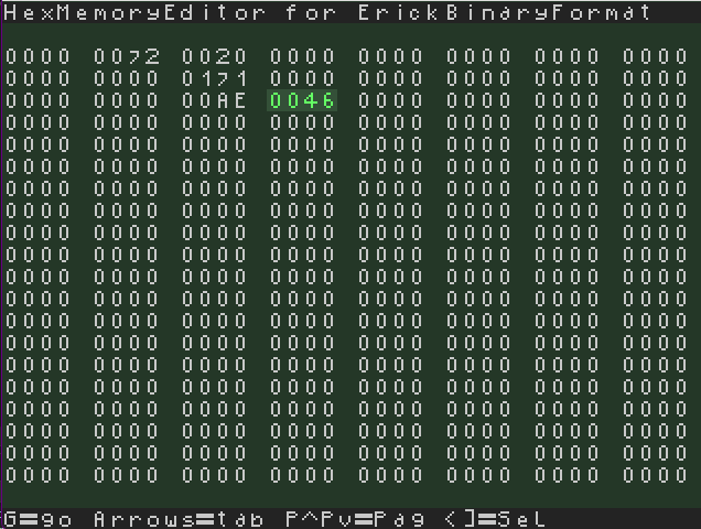 esa no es la ram real, primero, la posicion de memoria de una variable no depende del dispositivo por que esa memoria solo es usada por ErickBinaryFormat, para saber donde esta una variable, tienes que saber su valor y su equivalente en hexadecimal, si ya sabes donde esta la variable y te aseguraste de que el juego no la cambia de lugar o hace variables fantasmas entonces presionas la letra g y escribes la posicion de memoria en decimal (esto para no hacerlo tan dificil y que puedas saber donde esta), una pista es que si una casilla tiene el valor 0 (0000) entonces es por que o no se ha usado o ese es su valor, aunque la mayoria de las veces una casilla nula es por que no se ha usado, cuando la encuentres tendras que presionar enter para entrar al modo editor, cuando estes en el modo editor simplemente le sumas 1 a su valor presionando la flecha arriba, le restas 1 a su valor con la flecha abajo, con la tecla e le asignas un valor numerico en decimal (tambien para no hacerlo dificil) , una vez que el valor es el que se quiere entonces volviendo a presionar enter sales del modo editor ,cuando estas fuera del modo editor puedes mover el cursor de edicion a todas las direcciones con las flechas del teclado tambien puedes cambiar de region rapidamente con las teclas de PageUp y PageDown para escrolear no en lineas , si no que en paginas que normalmente en mi pantalla de qemu cada pagina ocupa 160 casillas de memoria asi que cada linea ocupa 8 casillas y cada pagina ocupa 20 lineas, asi que si estoy en el rango de la linea 0 a 20 entonces al ir a la siguiente pagina vere las lineas de 20 a 40 con todo y sus casillas