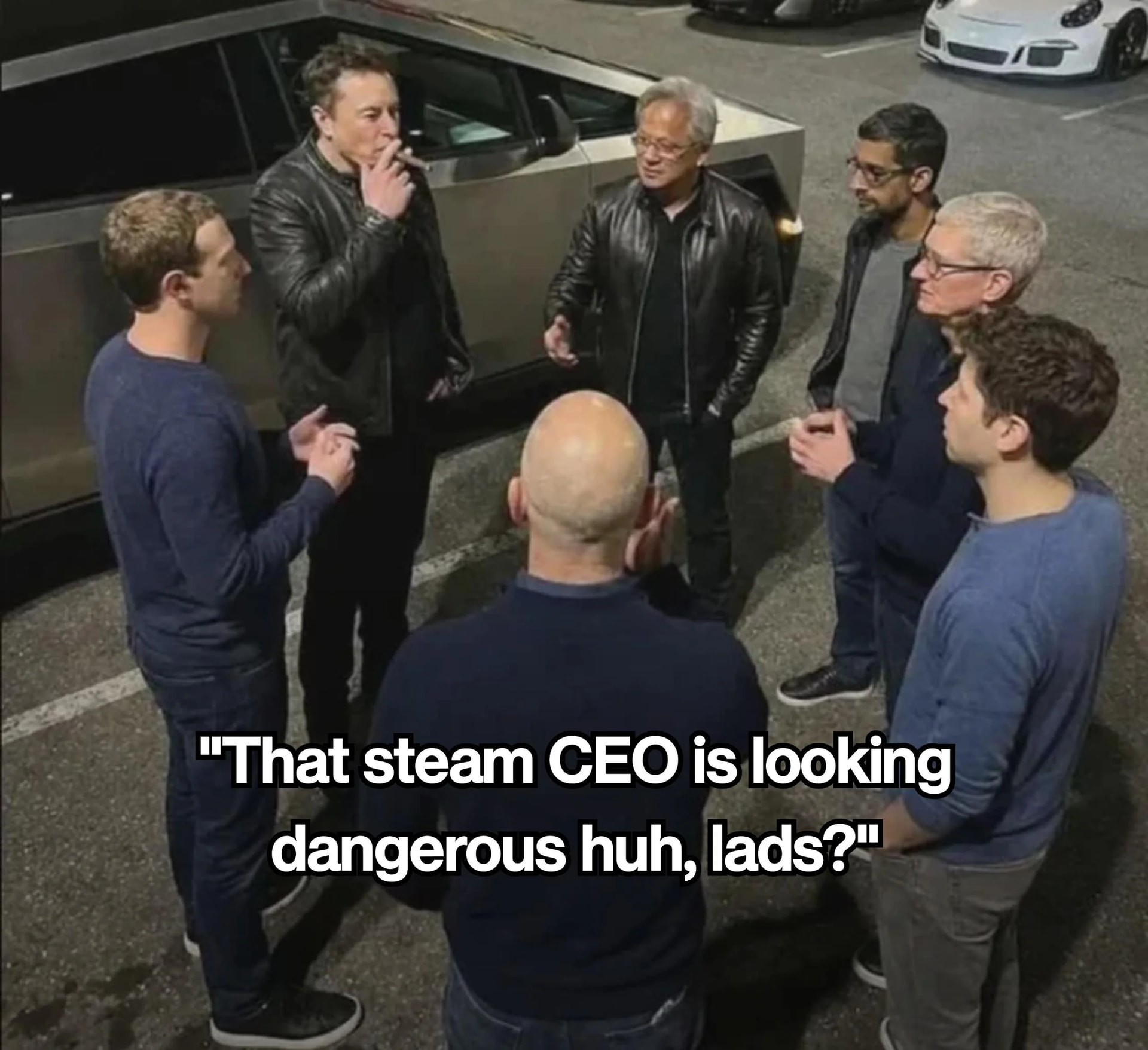 Que todos esten al lado del Cybertruck de Musk hace que la escena de la foto sea absoluto cine.