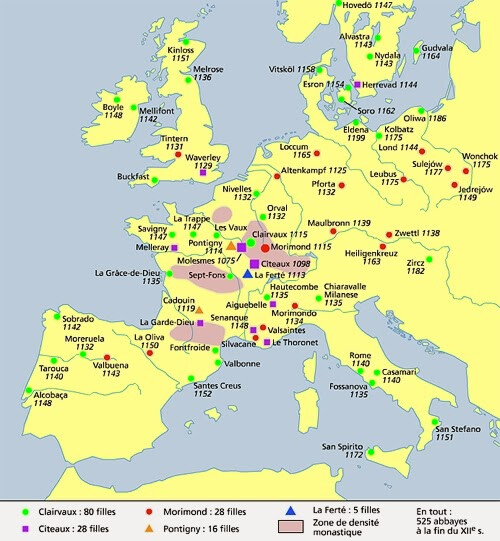 La orden experimentó una expansión espectacular en los siglos XII y XIII, partiendo de la abadía madre de Cîteaux (en la Borgoña, Francia), se extendieron rápidamente por toda Europa occidental. La mayor concentración estaba en Francia, claro, pero hubo una significativa presencia en España, Portugal, Inglaterra, Irlanda, Italia, Países Bajos, Alemania, Austria, Bohemia, Polonia… Incluso llegaron Escocia, Suecia y Tierra Santa (evidentemente explicado usando naciones modernas para no liarnos).