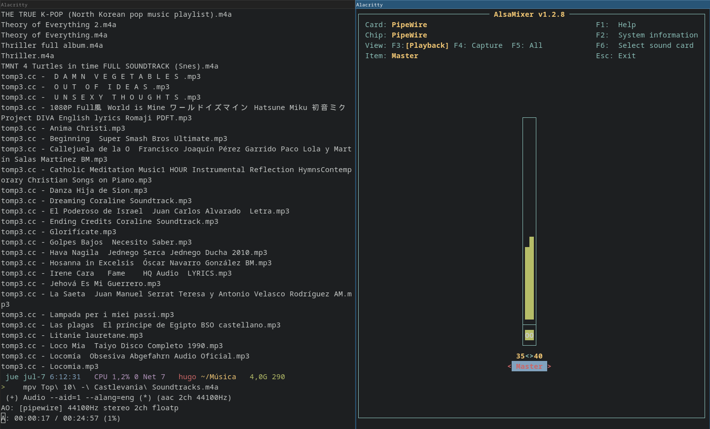 El reproductor mpv, junto con el panel de sonido alsamixer son los únicos programas que necesitas para reproducir cualquier formato multimedia a tu gusto - incluida, la música, por supuesto.